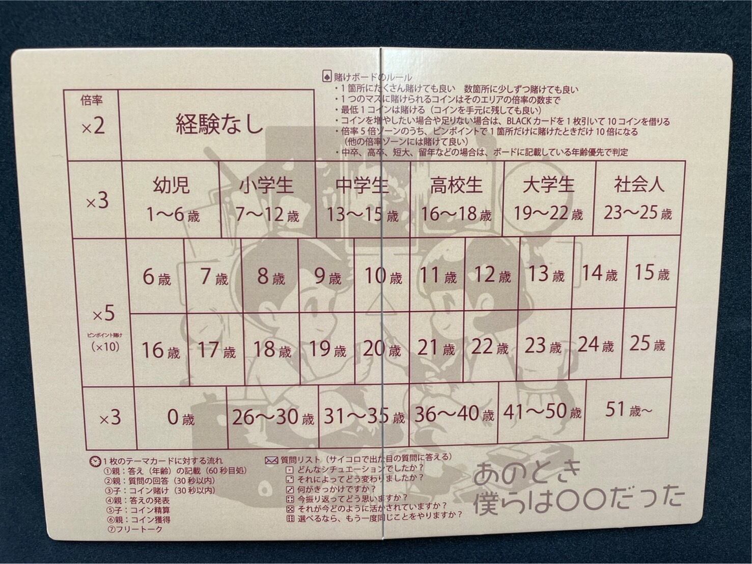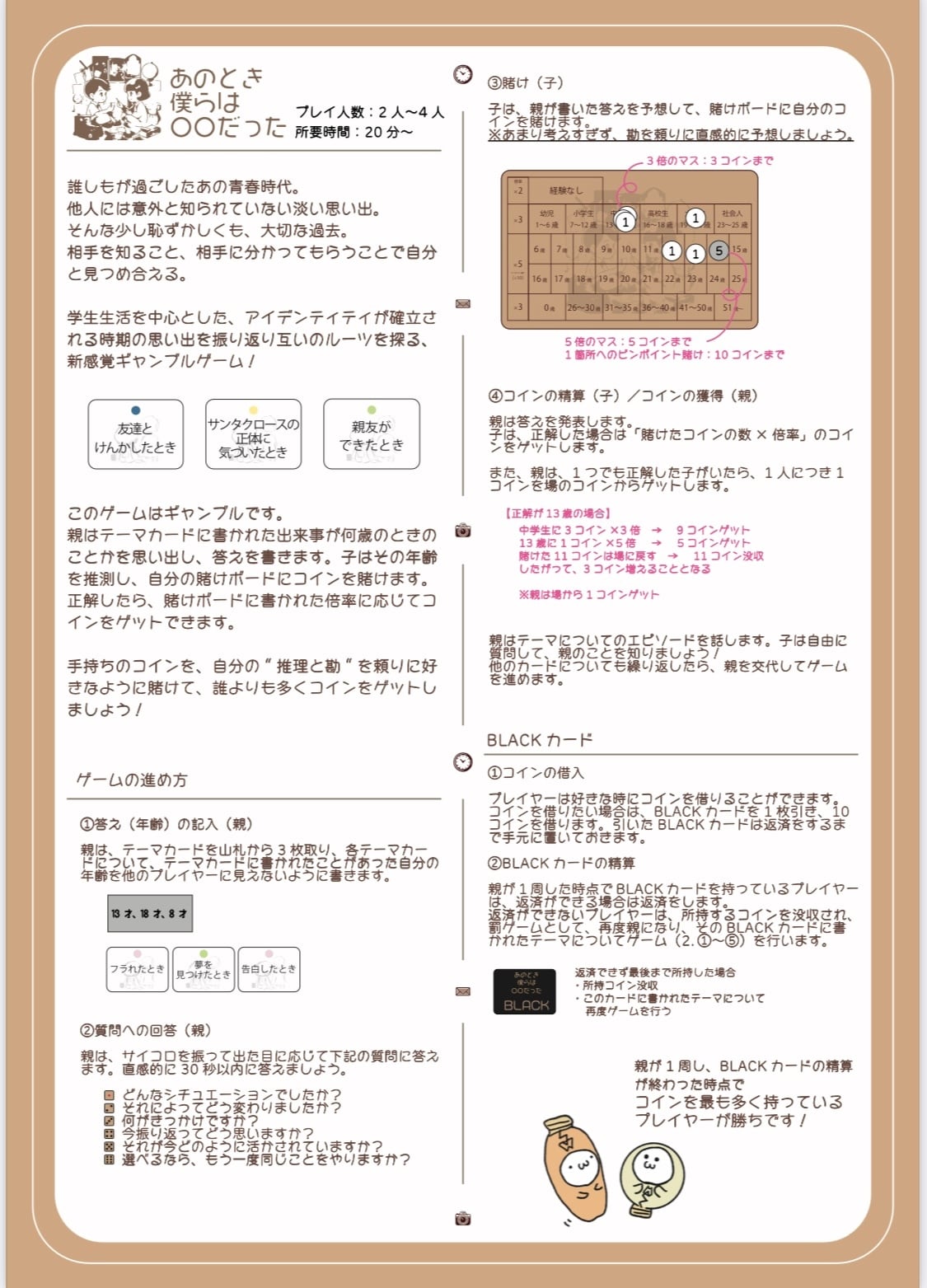親はテーマカードに書かれた出来事が何歳のときのことかを思い出し、答えを書きます。子はその年齢を推測し、自分の賭けボードにコインを賭けます。正解したら、賭けボードに書かれた倍率に応じてコインをゲットできます。 手持ちのコインを、自分の“推理と勘“を頼りに好きなように賭けて、誰よりも多くコインをゲットしましょう!