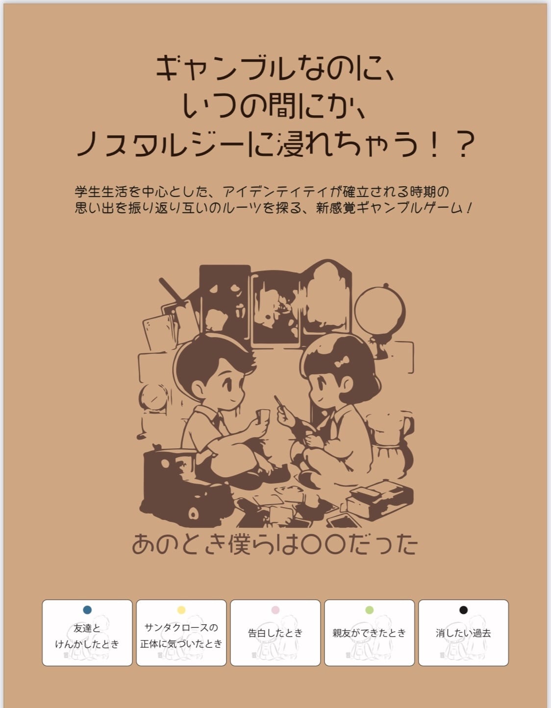 学生生活を中心とした、アイデンティティが確立される時期の思い出を振り返り、互いのルーツを探る、新感覚ギャンブルゲーム。